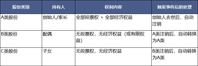 在这个结构下,创始人在世时,通过持有A类股份,对公司拥有完全的控制权和收益权。创始人去世后,A类股份自动注销,配偶持有的B类股份自动"升级"为A类股份,从而接管公司的控制权和收益权。若配偶也去世,则子女持有的C类股份再"升级"为A类股份。