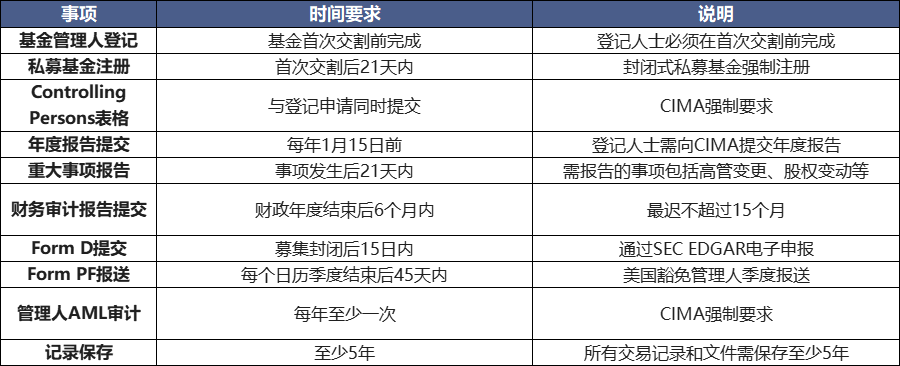 年度报告:基金管理人(如为登记人士)需要在每年1月15日前向CIMA提交年度报告,说明基金的运营情况、合规状况等。