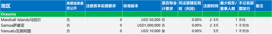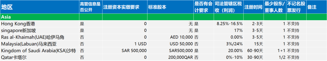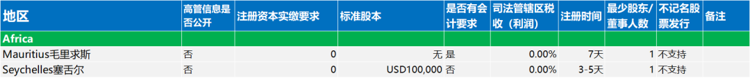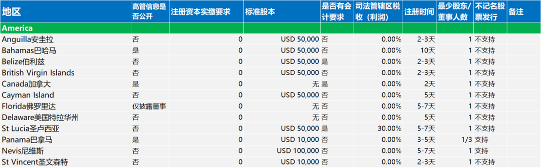 文章涵盖欧洲、美洲、亚洲、非洲和大洋洲地区的公司注册要求。内容包括各地区对高管信息公开、注册资本实缴要求、标准股本设定、会计规定、企业所得税率、注册耗时、最少股东/董事人数以及不记名股票发行的政策等。