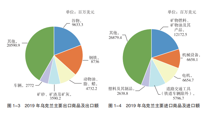 乌克兰主要出口商品包括粮食、动物产品、工业制成品、矿产品等。主要进口商品包括矿 产品、化工产品、机械设备及交通运输工具等