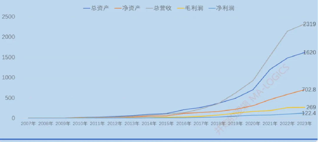 得益于一路扩张的精准布局,立讯精密内涵+外延式增长取得了巨大的成功,公司取得了亮眼的经营业绩。上市以来,立讯精密总资产CAGR2010-2023年为39.97%、净资产CAGR2010-2023年为33.09%、总营收CAGR2010-2023年为51.91%、净利润CAGR2010-2023年为41.90%、总市值CAGR2010-2023年为35%。这增速远远高于同期中国GDP CAGR2010-2023年8.98%的水平,是其三倍多。