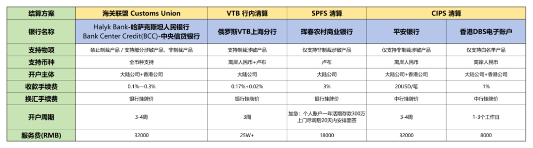 中国银行为代表,像平安、建行及全国性银行都是通过中行来清算。入账审核非常严格,并且目前只支持食品、日用品等相关的业务。审核已经不再是严控物项,目前已经发展到物项、交易对手、对手行、承运人甚至是载具提供商本身都要做到完全的尽调清查。主要以存量大客户为主,小客户的业务基本上都已经暂停。新开户渠道已经关闭,除非日均余额10个亿以上客户有机会。目前仅平安银行放开一点口子可以申请开户。需要进出口额在三到四千万,非制裁涉敏产品。支持大陆公司和香港公司开户,仅支持人民币收款,加急可3-4周下户。
