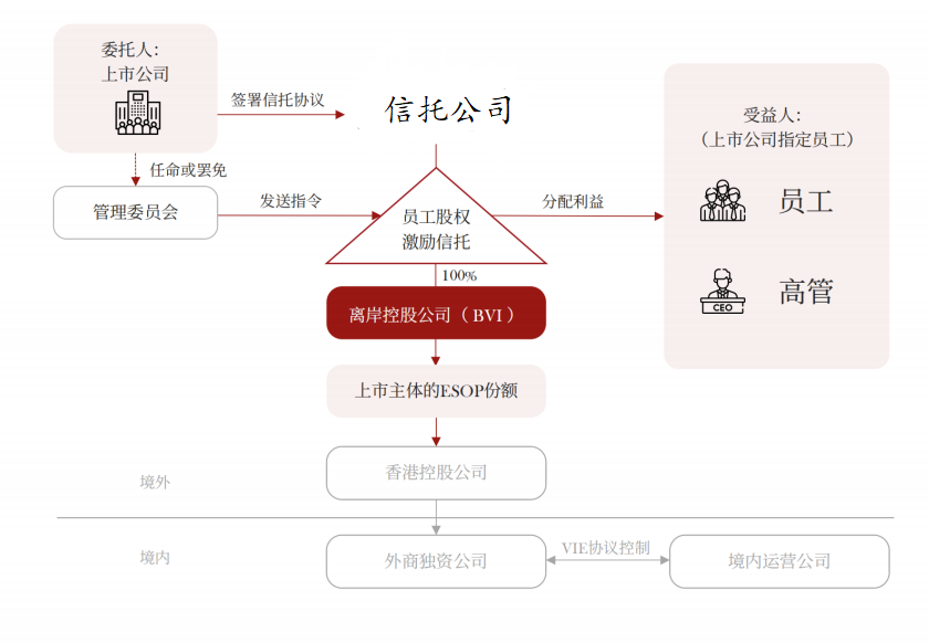 员工持股计划ESOP是指由企业内部员工出资认购本企业部分股权,该企业委托一个专门的信托机构以社团法人身份托管运作,集中管理,并参与董事会管理,按股份分享红利的一种新型股权安排方式,利用信托计划作为载体,员工通过该载体来间接持股公司,激励对象(高管/员工)成为境外ESOP信托受益人。