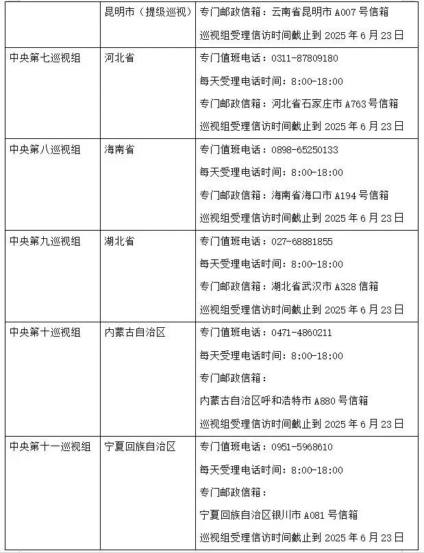 据悉,各中央巡视组将在被巡视地区工作2个半月左右,期间设立专门值班电话和邮政信箱,主要受理反映被巡视党组织领导班子及其成员、下一级党组织主要负责人和重点岗位人员问题的来信来电来访,重点是关于违反政治纪律、组织纪律、廉洁纪律、群众纪律、工作纪律、生活纪律等方面的举报和反映。巡视组受理信访时间截止到2025年6月23日。