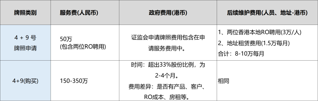 2) 申请 4+9 号牌照后,再申请 1 号牌照,服务费用为 15 万人民币,时间为 2-3 个月。