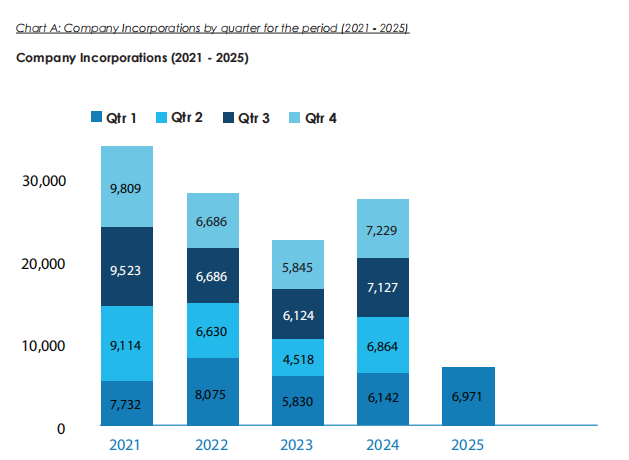2025年Q1新注册商业公司(BCs)精确达6,971家(表1/P2),较2024年Q1的6,142家实现13.50%同比增长,环比2024年Q4的7,229家下降3.57%。截至2025年3月31日,注册实体总量锁定361,167家,保持全球离岸枢纽地位。
