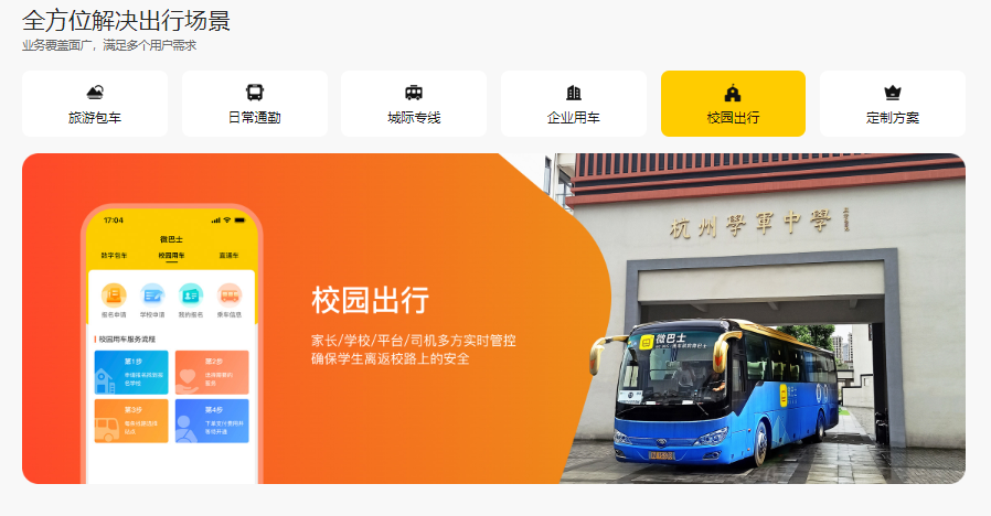 企业运营至今,用户可以通过平台进行目的地商旅包车,大客户通勤班车,周边短途出游,城际专线预订以及全球中文包车服务预定,针对不同出现场景,服务车型覆盖5-55座,我们提供多样化的产品和服务,吸引国内和全球日益增长的出行群体。微巴士始终以助力全球集约出行行业产业升级为己任,致力于打造“数据+平台+算法+运营”的全球中文包车及定制旅行平台,为客户营造安全、高效、智能和丰富出游服务场景。
