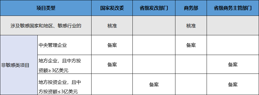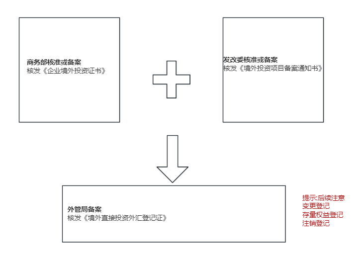 发改委核准或备案→商务部核准或备案→外汇管理局备案(银行放外汇,外管局监管)→实施ODI。