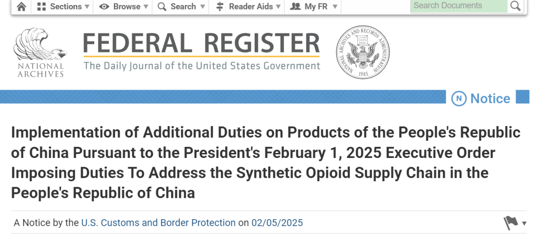 据美国《联邦公报》,自当地时间2025年2月4日起,所有进入美国消费或从仓库提取消费的原产于中国及中国香港商品,均需按新规缴纳额外关税(即加征10%关税)。除特定豁免类别外,所有中国及中国香港产品无论货值高低,均不再享受《美国法典》第19卷第1321(a)(2)(C)条规定的“最低限度免税”待遇。