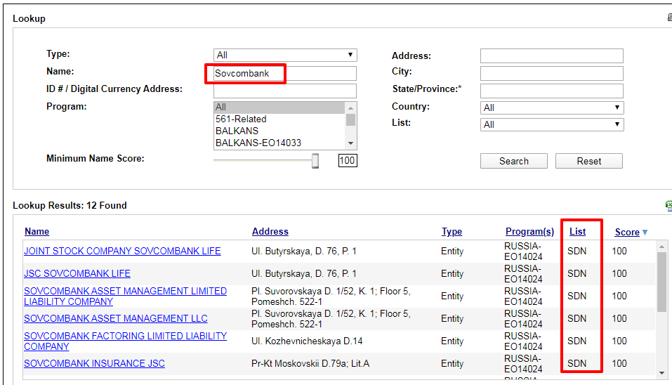 查询客户银行名称,如查询结果有显示SDN或者CAPTA字样,则为受制裁。