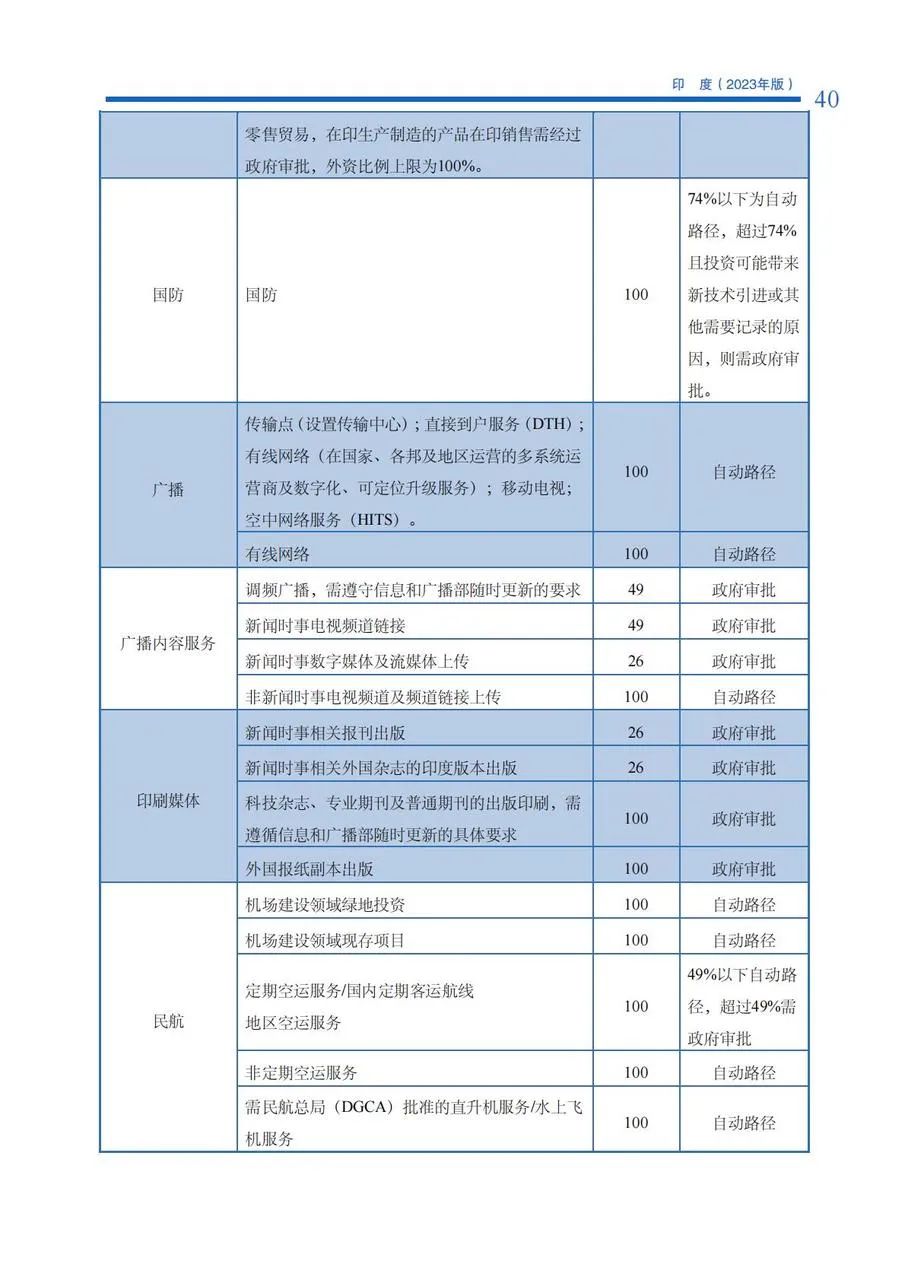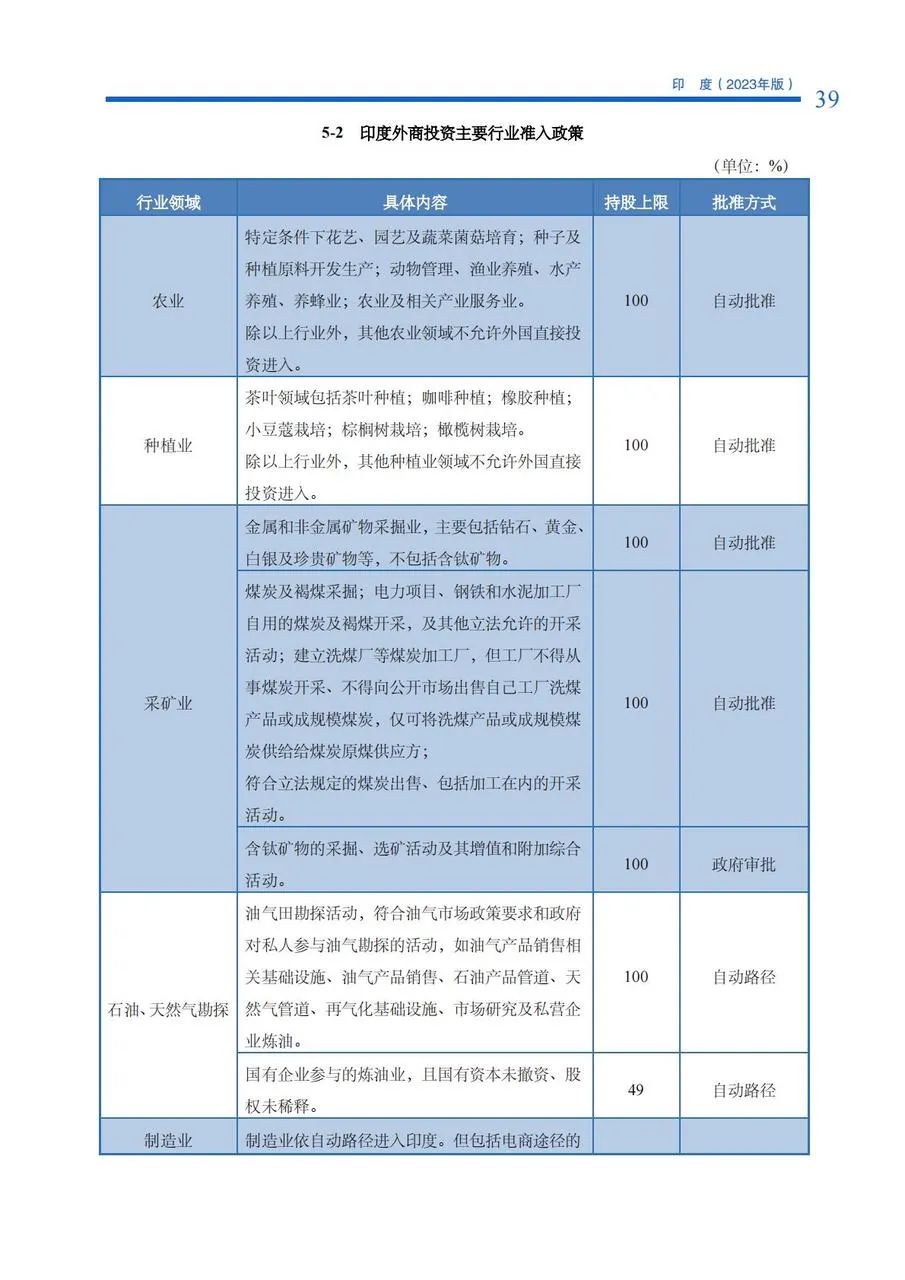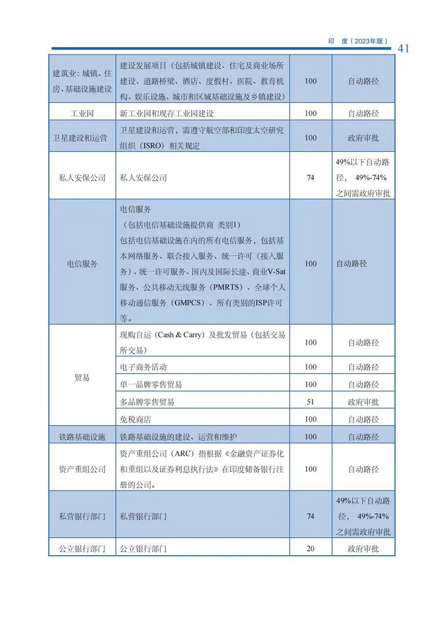 投资于保留给小型企业的经营项目,需获政府批准。根据2022年9月15日印度中小 企业部发布生效的最新政策,小型企业的一般定义为缴足股本不超过4000万卢比,且营 业额不超过4亿卢比。截至2023年,印度政府仍保有358类要求从小企业采购的商品清单。非小型企业在取得工业许可证后,亦可经营保留给小型企业的产业项目,但该项目的出口比例要求在50%以上。为了促进本国的小微企业,印度政府采取了各种支持举措,该门“Atmanirbhar Bharat”计划下发布了各种公告,例如,高达30万印度卢比的无抵押 自动贷款、禁止全球招标, 以为中小微企业提供更好的机会。