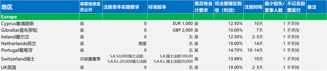 文章涵盖欧洲、美洲、亚洲、非洲和大洋洲地区的公司注册要求。内容包括各地区对高管信息公开、注册资本实缴要求、标准股本设定、会计规定、企业所得税率、注册耗时、最少股东/董事人数以及不记名股票发行的政策等。