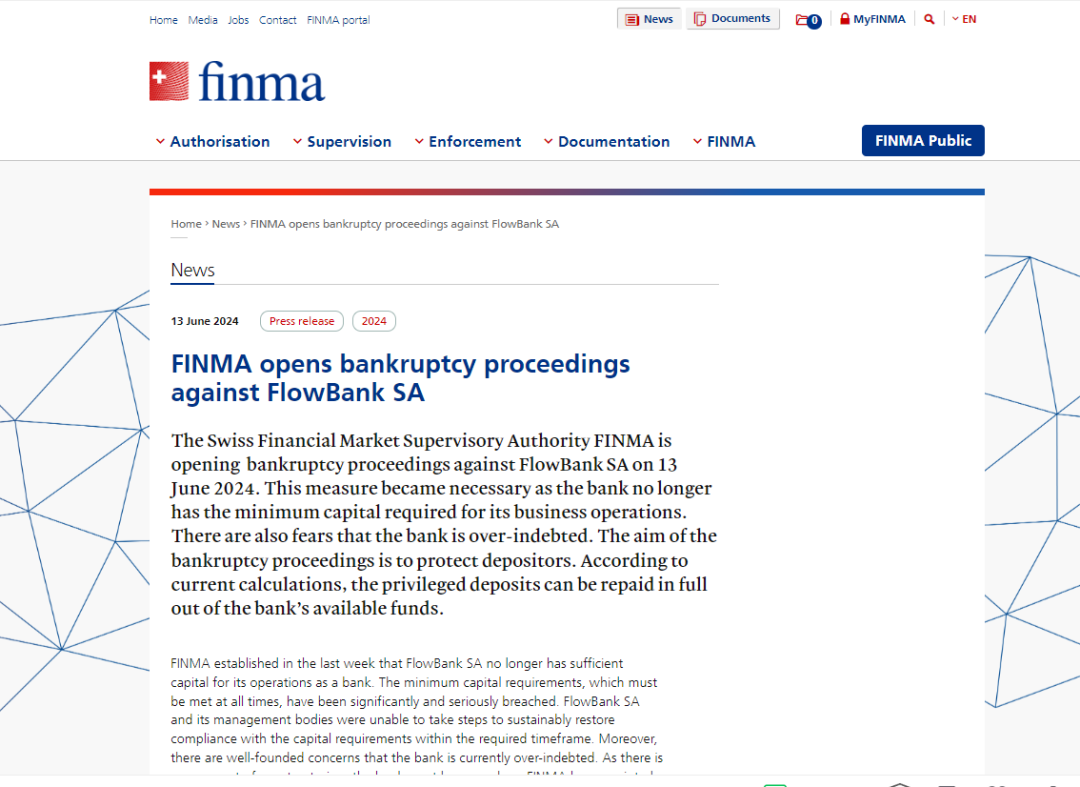 FlowBank的关闭无疑给瑞士金融市场带来了一定的震动。我们一起来看下FINMA的官方通知。