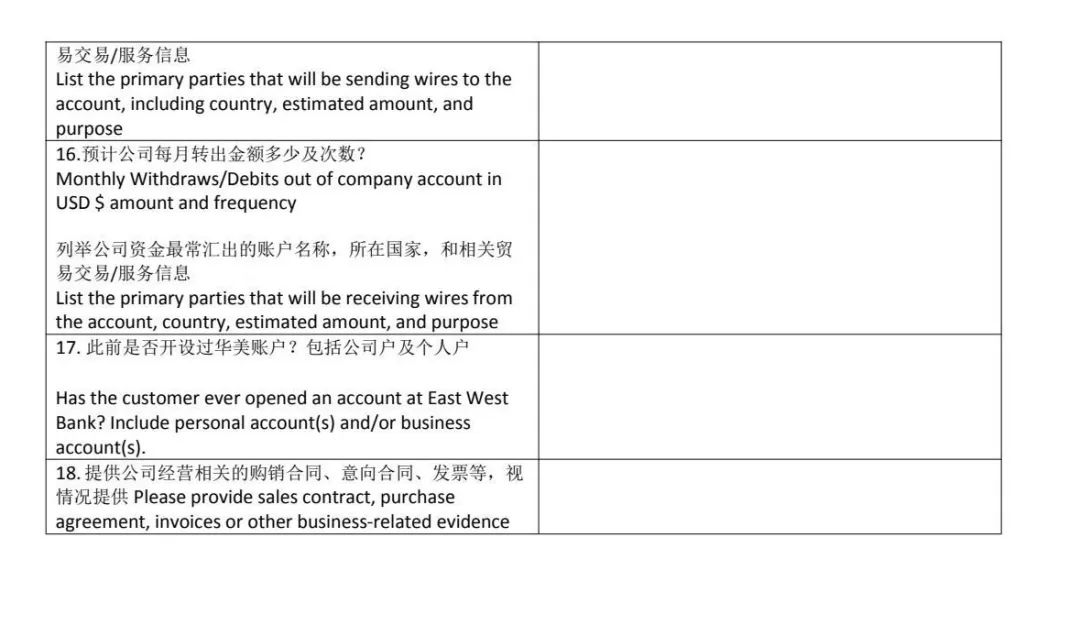 • 公司业务详情:描述公司主营业务、商业模式、预期交易伙伴及金额、预计年度营业额、账户平均月余额等。