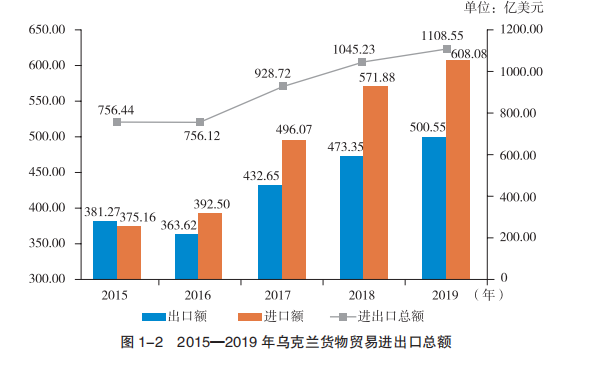 2019年,乌克兰货物贸易进出口总额为1108.55亿美元,同比增长6%。其中,出口额为500.55亿美元,同比增长5.8%;进口额为608.08亿美元,同比增长6.3%,贸易逆差107.45亿美元。
