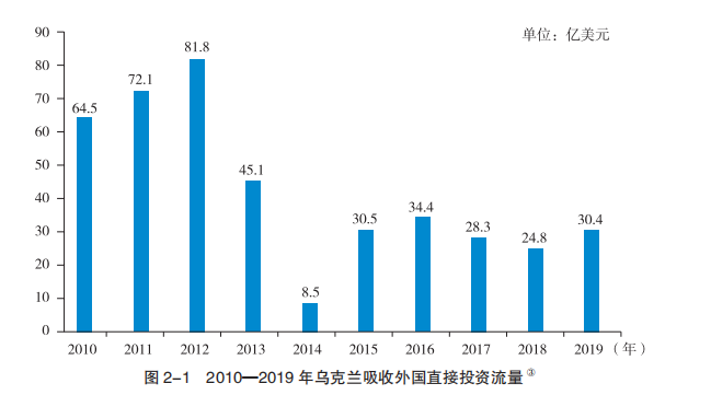 2014 年,受危机影响,乌克兰吸收外国 直接投资大幅下跌。2015 年以来,外国直接投 资逐步恢复。2019 年,乌克兰吸收外国直接投 资流量为 30.43 亿美元,同比增长 22.58%。