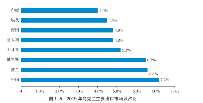 2019年,乌克兰货物出口主要对象为中国、波兰、俄罗斯、土耳其等地;进口主要来源地 为中国、俄罗斯、德国、波兰等。