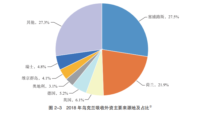 根据乌克兰经济发展、贸易和农业部的 数据显示,乌克兰吸收投资主要集中在制造 业领域。2018 年,制造业吸收外资 8.46 亿美 元,占比 34.1%;其次是农林渔业,吸收外资3.1 亿美元,占比 12.5%。乌克兰吸收外资前三大来源地分别为塞浦路斯、荷兰和英国。
