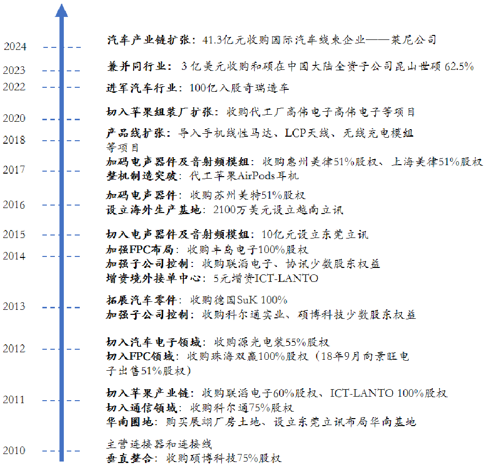 立讯精密从并购起家,上市以来,立讯精密顺应市场需求、通过并购来推进战略升级、产品和应用规划实施,成为推动其快速增长的重要策略。2010年来,立讯精密的战略定位经过了四次调整,并通过并购进行实施: