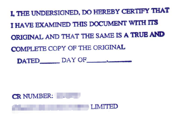 政府核证副本:是由政府办公室官方人员签发的真实副本文件,该机构同时也负责文件正本签发,例如公司注册处查册结果真实副本、出生及结婚记录真实副本等等。