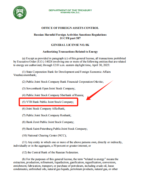 根据美国财政部外国资产控制办公室OFAC,于2024年10月30日发布的《俄罗斯有害外国活动制裁条例》(31 CFR part 587)中的“一般许可证第8K号”,授权与能源相关的交易。将对俄罗斯部分银行以及部分业务做接触限制措施,其中包含VTB银行