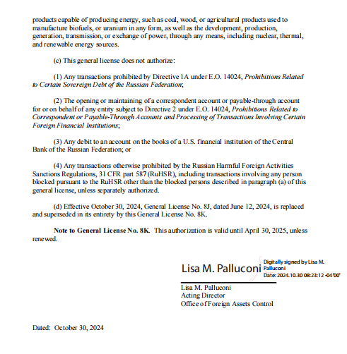 5)生效日期:2024年10月30日,一般许可证第8J号(2024年6月12日颁布)被一般许可证第8K号完全取代。该授权有效期至2025年4月30日,除非更新。