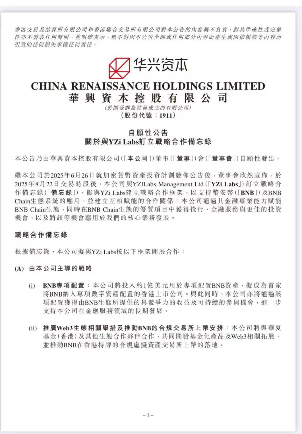 港股上市公司华兴资本官宣:豪掷1亿美元专项买BNB,和YZi Labs联手——推动BNB合规上所、布局Web3生态、发金融产品。