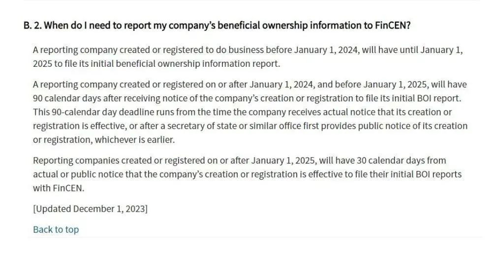 1.大多数实体必须在2025年1月1日之前提交这些报告。然而,2024年及以后成立的实体必须在实体成立后30天内提交报告,尽管有人提议仅将2024年成立的实体的报告期限延长至90天。