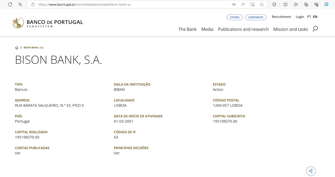 葡萄牙银行监管机构对贝森银行持牌进行授权认证: