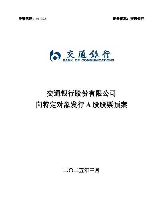 交通银行公告,2025年3月30日,董事会审议通过并披露向特定对象发行A股股票方案。交通银行本次发行股票数量不超过137.77亿股,计划募集资金总额1200亿元,发行对象为财政部、中国烟草总公司及其全资子公司中国双维投资有限公司。本次发行价格较交通银行近期A股二级市场价格有一定溢价,发行对象承诺长期持有本次认购股份。本次定增的募集资金将用于补充交通银行核心一级资本。