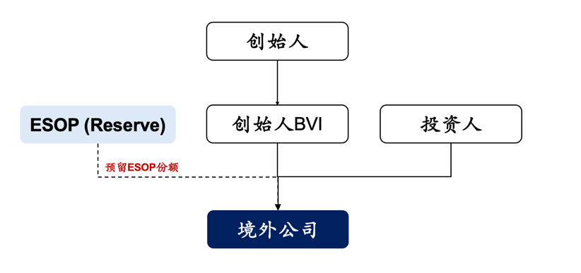 预留股权架构,通常被称为Reserved ESOP,或称预留ESOP,是一种由境外公司在成立后或者存续过程中预先保留一定数量的普通股,作为员工激励股权用于将来发行。这种做法与境内股权激励中的创始人通过设立持股平台(例如有限合伙企业)预留激励股份的方式有所不同。在预留股权架构中,境外公司预留的股份只有在激励对象行使权利时才会实际发行。以下是预留股权架构的示意图: