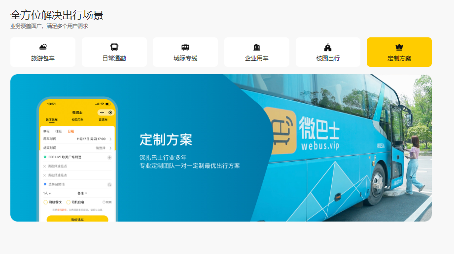 微巴士打造全球一站式定制包车行业全流程服务平台,通过数字化技术赋能定制包车出行场景运营,业务计价、需求管理、调度派单、服务监管、财务结算、车队和司机导游管理等多个环节;通过平台化数字化高效运营能力和标准化服务品质流程和强大供应商整合能力,推进产业中人力,资产和资金的周转效率提升,加快产业升级。