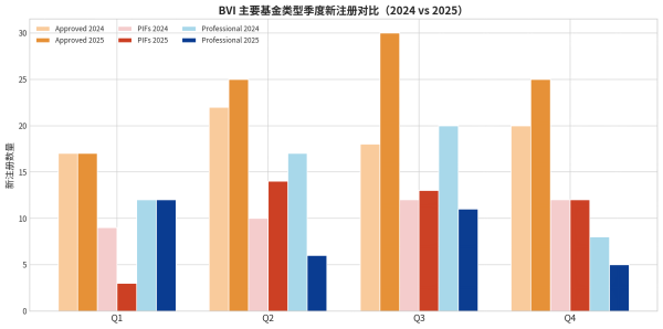 从新注册基金的结构占比来看,Approved Funds的份额从2024年的35.2%大幅扩张至2025年的 45.8%,几乎占据了BVI新注册基金的半壁江山。如果加上私募投资基金(PIFs)的19.8%,这两种轻量化/封闭式基金在2025年的新注册占比合计高达 65.6%。
